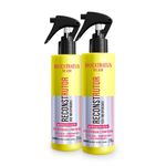Reconstrução: após lavar os cabelos com shampoo, borrife o Reconstrutor em toda a extensão dos fios, massageando suavemente. Deixe agir 2 minutos e enxágue. Pode usar antes ou depois da máscara. Cabelos oleosos podem dispensar o uso da máscara.