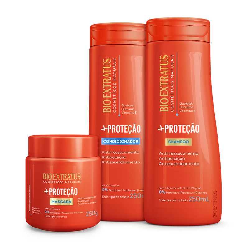Praia, piscina, rua... os cabelos sempre encontram agentes agressores, em qualquer ambiente. Para evitar que os danos aconteçam, a linha +Proteção blinda os fios contra poluentes, tem ação quelante que desintoxica, eliminando metais pesados, ajuda a evitar e a retirar o esverdeado causado na piscina, protege do sol, do calor do secador, do desbotamento e do ressecamento. Um verdadeiro escudo protetor para os fios.